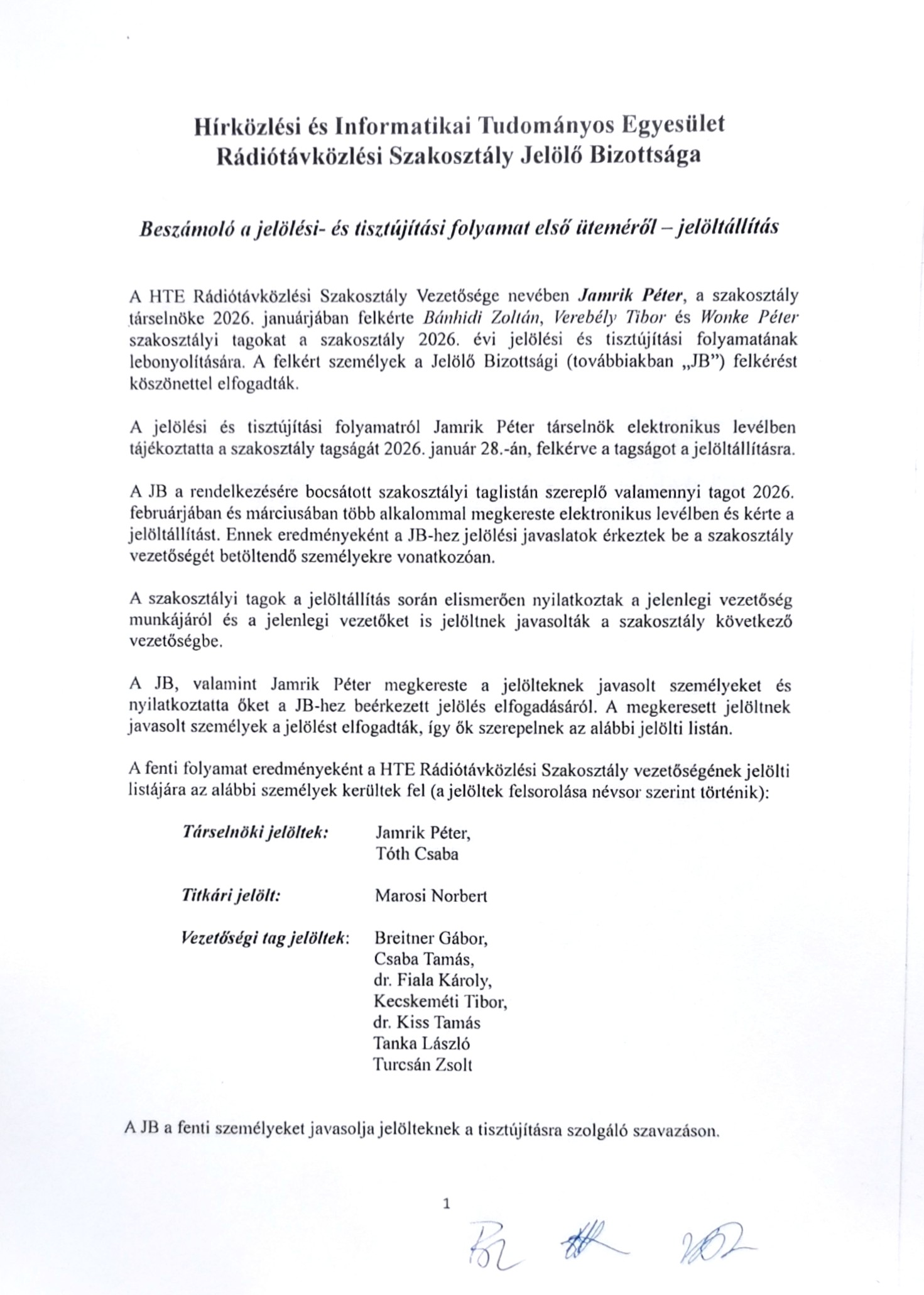 A Szakosztály tisztújításához a Jelölő Bizottság a munkája első részét elvégezte, arról beszámolt és összeállította a jelölti listát. Ezeket a melléklet tartalmazza.